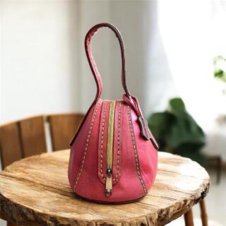 ed leather teardrop-shaped handbag, featuring bold yellow stitching, a vertical decorative strap, and a smooth, vintage-inspired design with a sturdy matching handle.