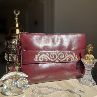 A luxurious burgundy clutch adorned with hand-stitched golden swirls. Elegant, timeless, and crafted to elevate any soirée or special occasion look.
