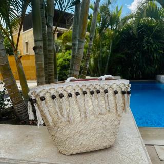 A stylish handwoven straw tote featuring tassel details and wooden bead accents for a chic bohemian look