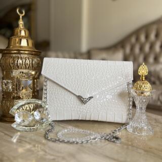 بيرلي كروك إنفلوب لوكس – حقيبة كلاتش عاجية مذهلة بنقشة تمساح لؤلؤية وقطعة معدنية فضية مزخرفة. تصميم أنيق على شكل مظروف مثالي لحفلات الزفاف والمناسبات الرسمية. أناقة كلاسيكية تلتقي بالأسلوب العصري.