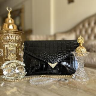 Black Croc Envelope Luxe – Sleek black clutch with crocodile-embossed texture and gold chain. Sophisticated envelope design with triangle accent. Perfect for elegant evenings and special occasions.
