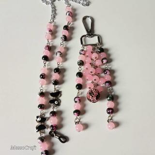 A glasses-chain and a bag charm set made of rose and black alabaster beads stones