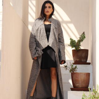 Made from a soft textured wool blend, it features a sculpted front cut, oversized lapels, and a flowing high-low hem for effortless movement and modern elegance.Details: