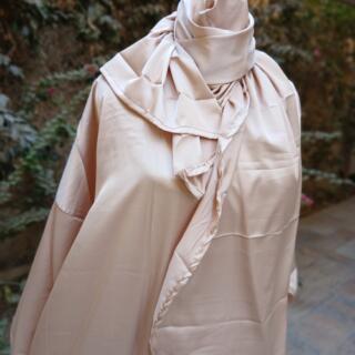 A warm handmade crochet cardigan featuring teal, white, and beige striped detailing with a relaxed, cozy silhouette—perfect for effortless everyday layering.