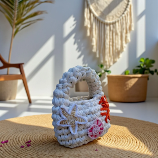 Dive into summer with our handwoven Ocean Mini Bag, Crafted with love and adorned with coral, shells, and starfish – it’s your beach day essential turned statement piec