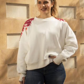 A timeless white sweatshirt elevated with delicate hand-embroidered floral details on the shoulders, adding a soft artistic touch to a cozy everyday essential. Designed with a relaxed silhouette and crafted from soft, breathable fabric, this piece brings together comfort and elegance effortlessly.