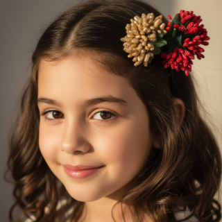 مصنوعة يدويًا بدقة عالية، تتميز بزهور صغيرة مجسّمة بلون أحمر قوي وذهبي لامع يعكس روح الموسم.