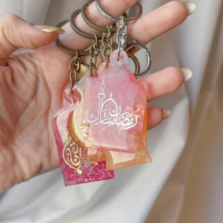 Handcrafted resin keychains featuring elegant Arabic calligraphy in vibrant tones with a pearlescent finish.