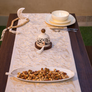 - النهايات: ينتهي الرانر بشكل مثلثي (Pointed ends) مزين بشرابة (Tassel) يدوية تمنحه مظهراً انسيابياً جذاباً.