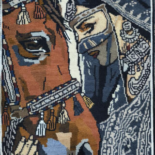 A heritage-inspired portrait capturing the soulful connection between a desert maiden and her stallion. Hand-stitched with premium virgin wool for a rich, textured finish.