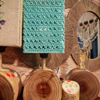 وحدة إضاءة من الخشب الطبيعي مع شابوه بخيوط الخيش الطبيعي ورسم بالخيط لزهور
