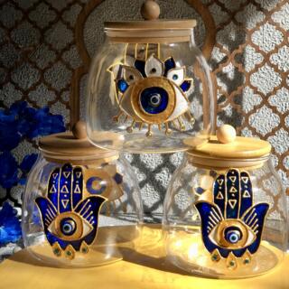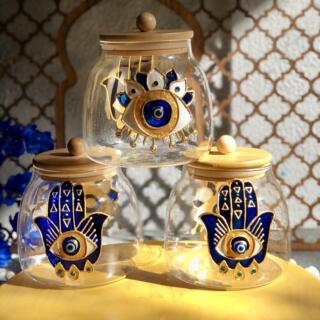 Hand painted new design of blue Kaf and eyes on glass jar