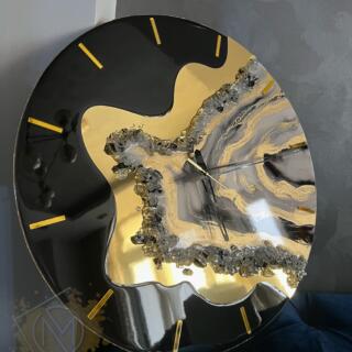 Resin on wood mixed with stones and crystals – and acrylic gold waves