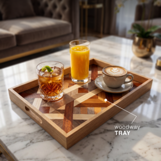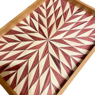 صنية مستطيلة مصممة بقشرة الاخشاب تنفذ ب تصاميم مختلفة و بالوان مختلفة وعليها حفر خارجي على اطار الصنية