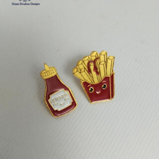 Gold plated brass stud pairing earrings fries and ketchup with red enamel (1.5 cm height)
