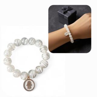 A bracelet made of white murano glass stone beads and a white round pendant with a shape of hand-hamsa made of tiny zircon