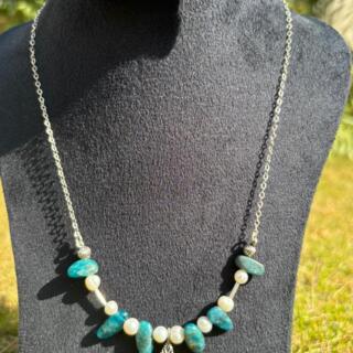 عقد فضة 925 معمول يدوي، متكوّن من أحجار أباتيت زرقا طبيعية مع لؤلؤ ودلاية صغيرة، تصميم بسيط وعملي.