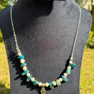 عقد فضة 925 معمول يدوي، متكوّن من أحجار أباتيت زرقا طبيعية مع لؤلؤ ودلاية عين حورس، تصميم بسيط وعملي.