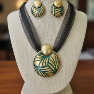 أضيفي لمسة من الرقي المستوحى من جمال الطبيعة إلى إطلالتك مع هذا الطقم الفريد. يتميز التصميم بزخارف نباتية متداخلة تجمع بين اللون الأخضر الداكن العميق وبريق الذهب الأخاذ.