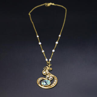 Brass necklace with pearls and abalone shell.