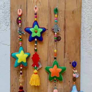 فرع زينة رمضان فردي علي شكل نجمة مع اكسسورات معدن شعبية و فانوس خشب شعبي شرابة خيط من اسفل.