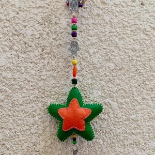 فرع زينة رمضان فردي علي شكل نجمة مع اكسسورات معدن شعبية و فانوس خشب شعبي شرابة خيط من اسفل.