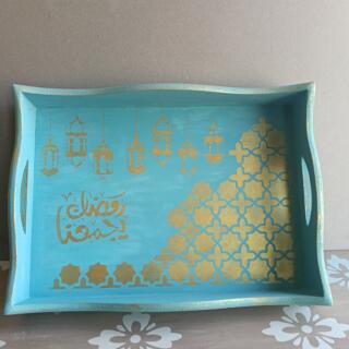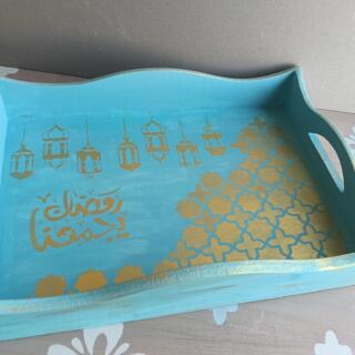 Tray size 25*34 cm painted in a green color with a touch of gold and stenciled with an arabic pattern, fawanees and رمضان يجمعنا word all in gold