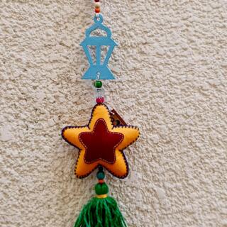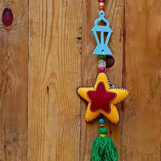 فرع زينة رمضان فردي علي شكل نجمة مع اكسسورات معدن شعبية و فانوس خشب شعبي شرابة خيط من اسفل.