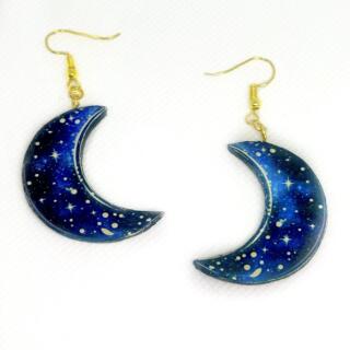 Elegant handmade crescent moon earrings with deep blue tones and starry details, adding a magical touch to any outfit, perfect for celebrating the spirit of Ramadan. -