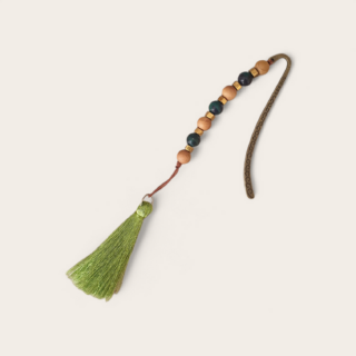 قطعة ديكور ل رمضان علي شكل هلال يتوسطه نجمة ويتدلي منه هلالين من الخشب وفصوص الالماظ الملون