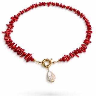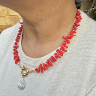 Everyday-elegant coral necklace with soft baroque pearl drop, quiet elegance with abaya for iftar & night gathering 🌙