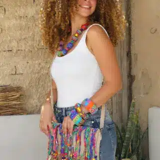 - Handmade Genuine leather bag with colorful cross-stitching.