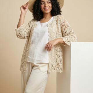 The ‘Dune’ Cardigan is a cozy and stylish piece, featuring a vibrant striped pattern in warm sunset hues. Hand-crocheted with love, it’s perfect for adding a touch of boho chic to your fall wardrobe