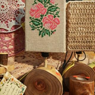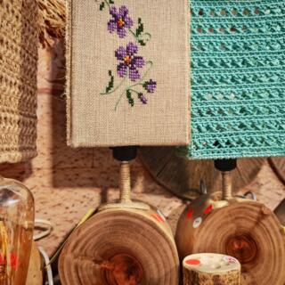وحدة إضاءة من مقطع مميز من الخشب الطبيعي (الزنزلخت)، مع شابوه من خيوط الخشب الطبيعي ورسم بالخيط لزهور