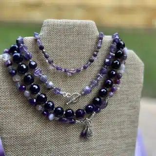 Hand knotted amethyst necklace, sterling silver clasp on the front