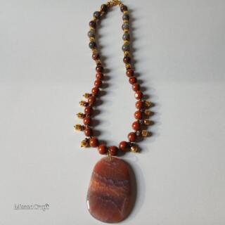 Statement necklace made of orange terracotta (brick) and grayish agate solmania stone beads with golden lava beads and a big orange terracotta gemstone