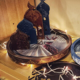 Wooden lantern (Fanous) with Islamic motifs decorated with glittery ribbons and stones.