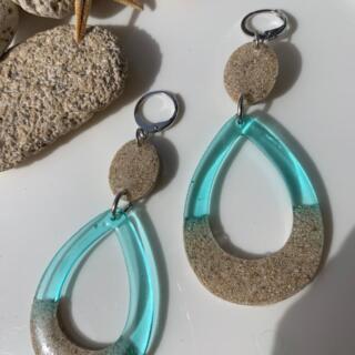 These earrings bring the tactile beauty of the beach to your jewelry collection. Each pair is handcrafted using genuine coastal sand, creating a natural texture that perfectly contrasts with the vibrant “water” above.