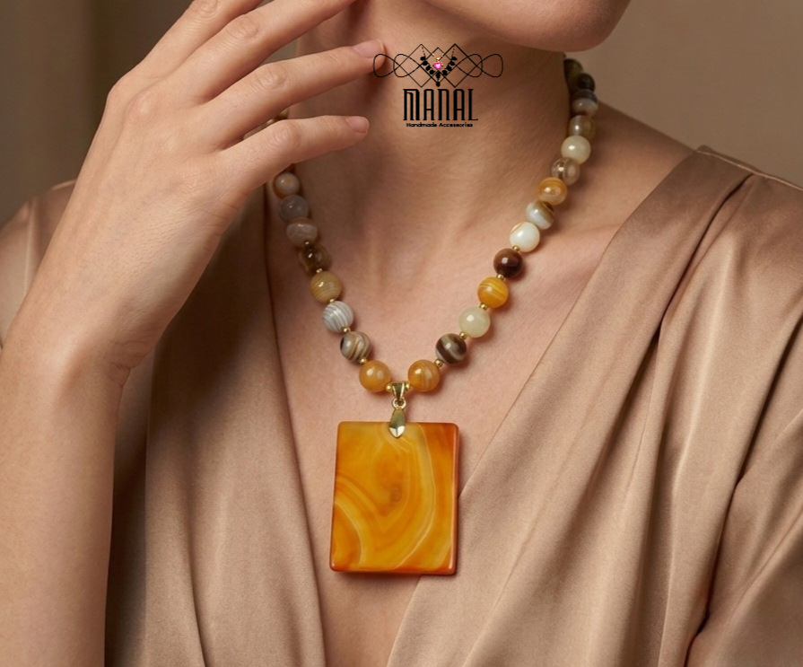 عقد من احجار العقيق السليماني بفواصل حجر هيماتيت ودلايه حجر جاسبر طبيعي