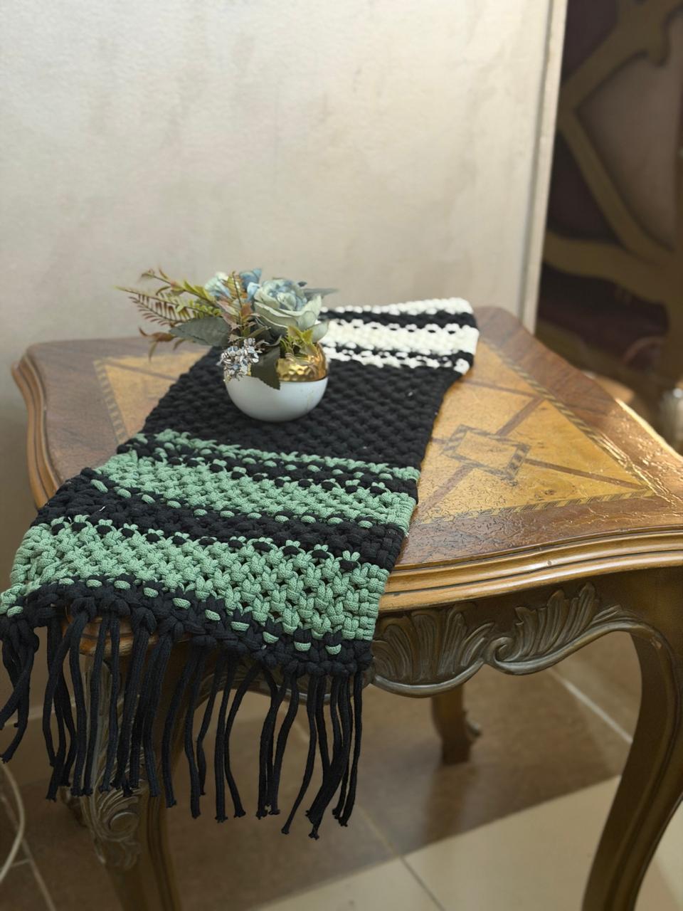 مفرش الطاولة: المفرش مصنوع من خيوط سميكة بألوان الأسود والأخضر الفاتح والأبيض. يتميز بنمط مخطط وله شراشيب سوداء طويلة متدلية من الأطراف.