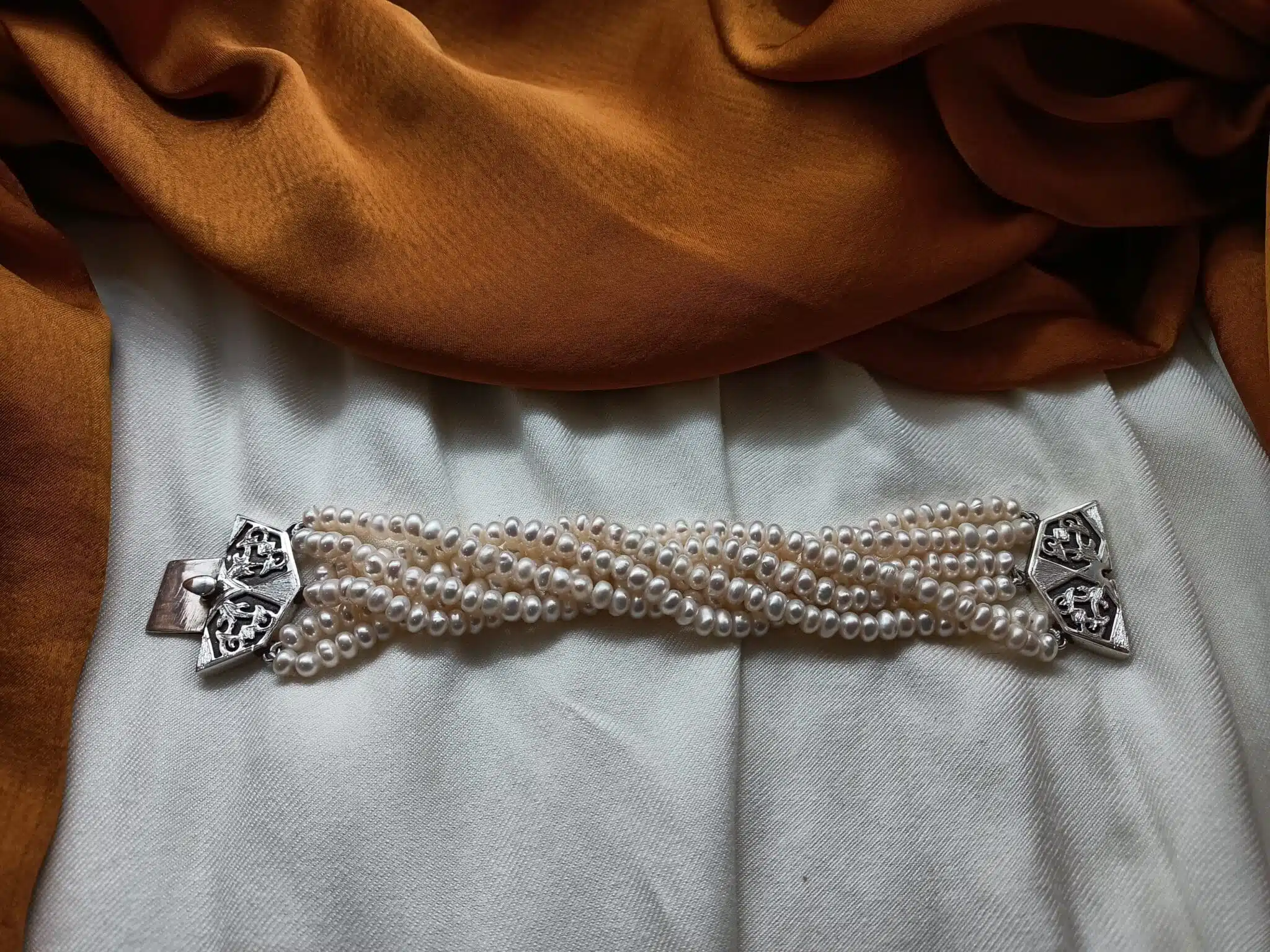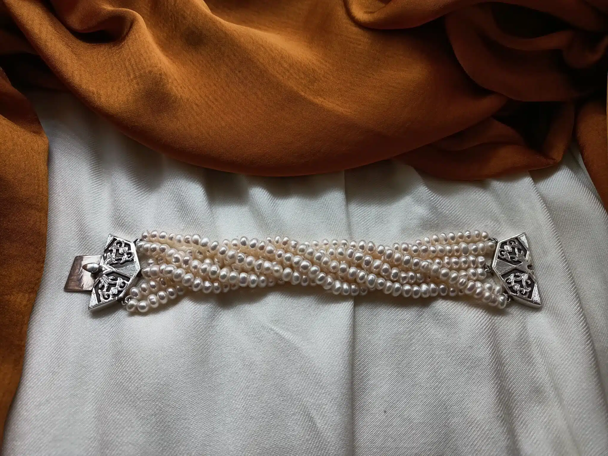 انسيال من الفضة الاسترليني الخالصة وأحجار اللؤلؤ الطبيعي بتصميم مميز يجمع مابين الزخارف الهندسية والنباتية