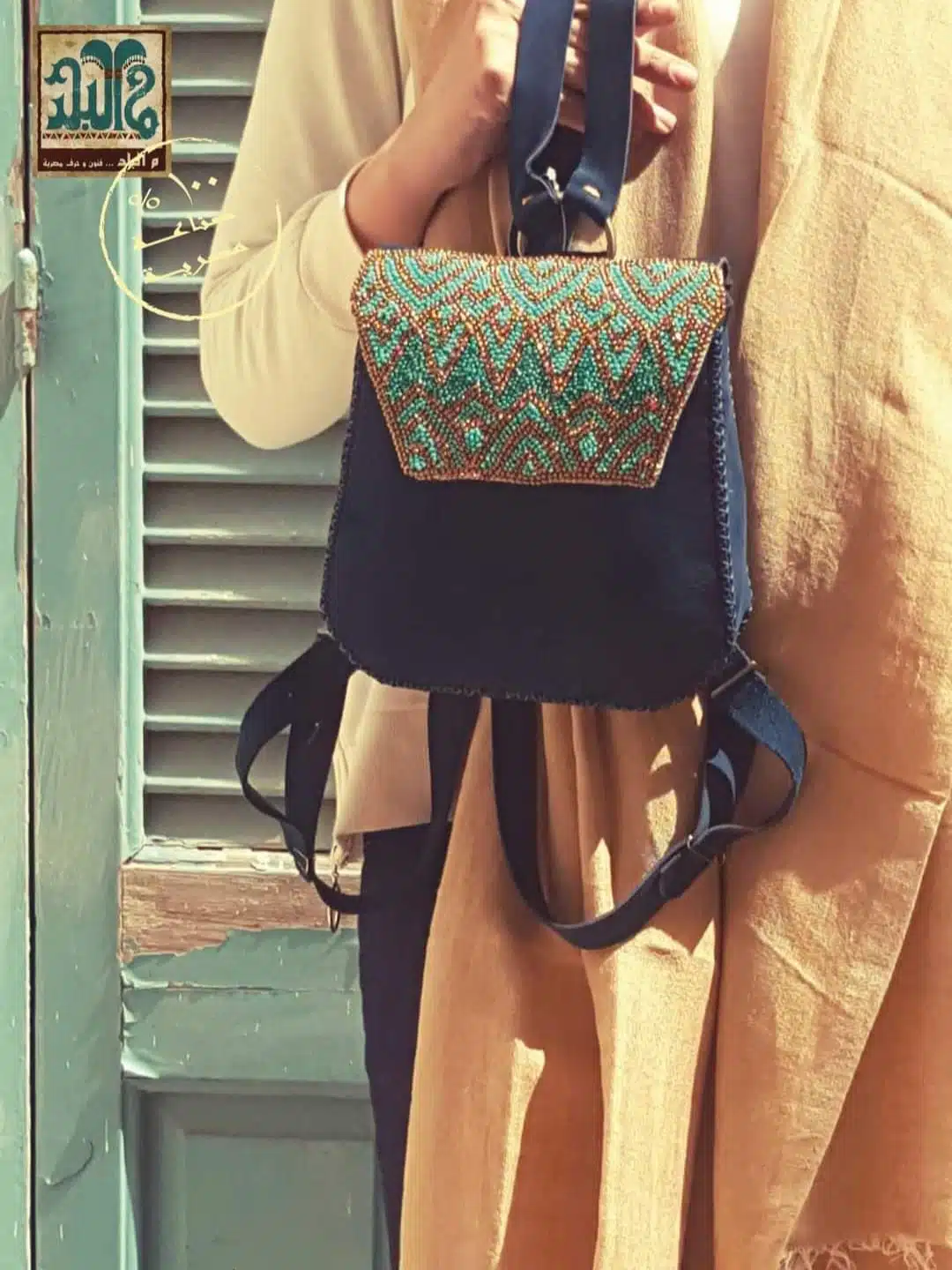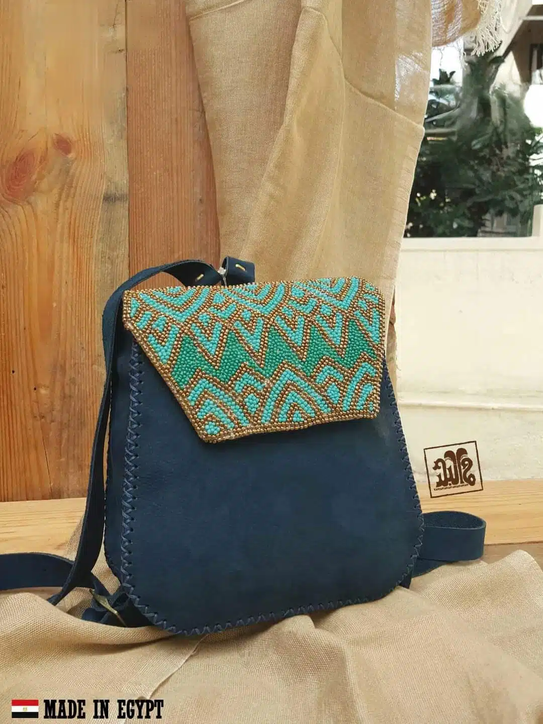 شنطة جلد طبيعي تقفيل يدوي مع تطريز خرز بأستخدام أسلوب النول الفرنسي اشكال هندسية الاكسسوار نحاس اكسيدية .