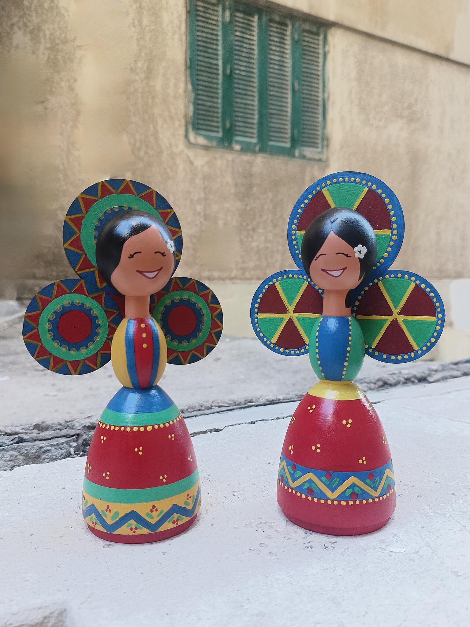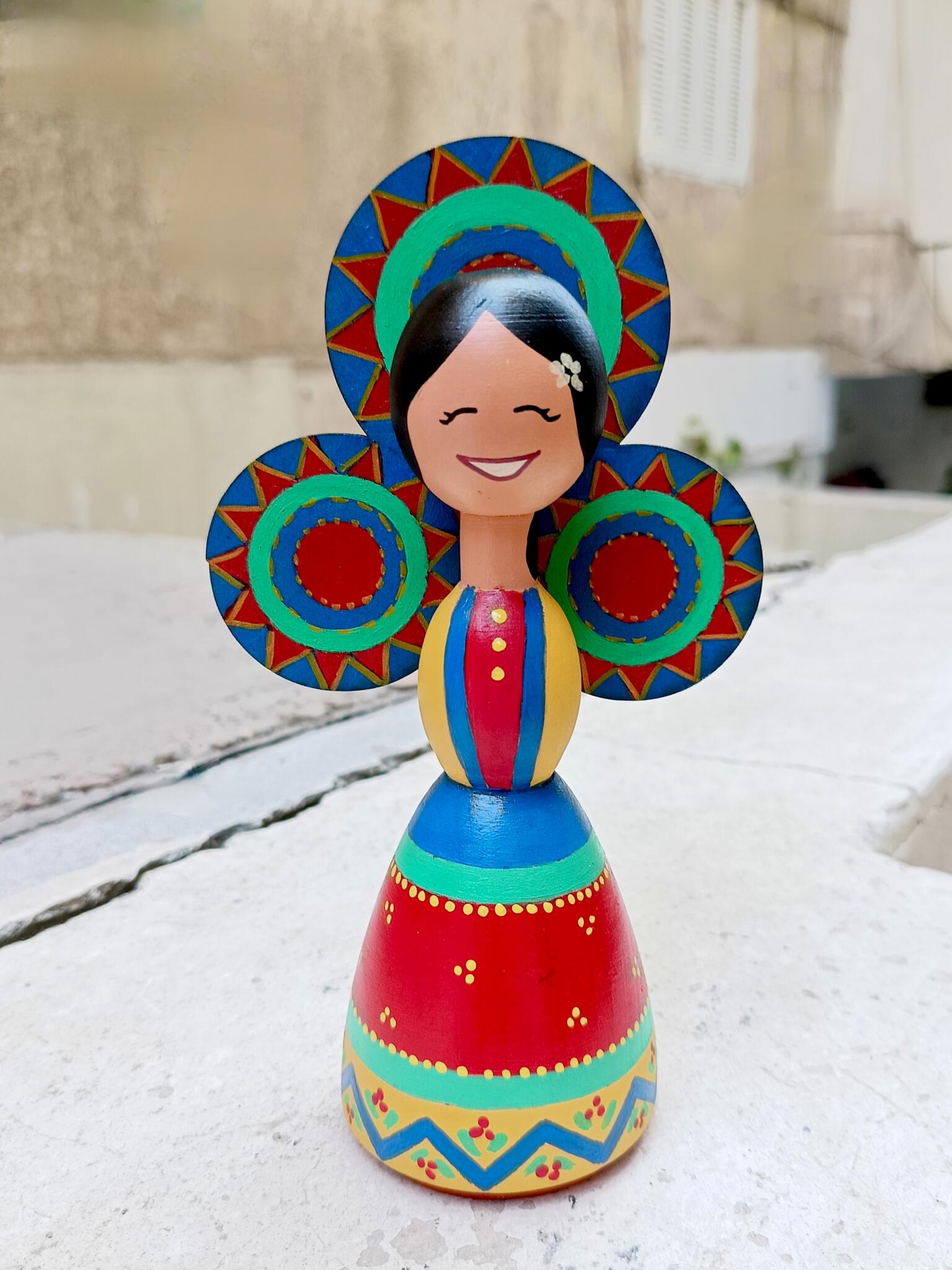 .عروسة مولد خشب رسم يدوي بألوان متنوعة بين الأحمر والأزرق والأصفر والأخضر