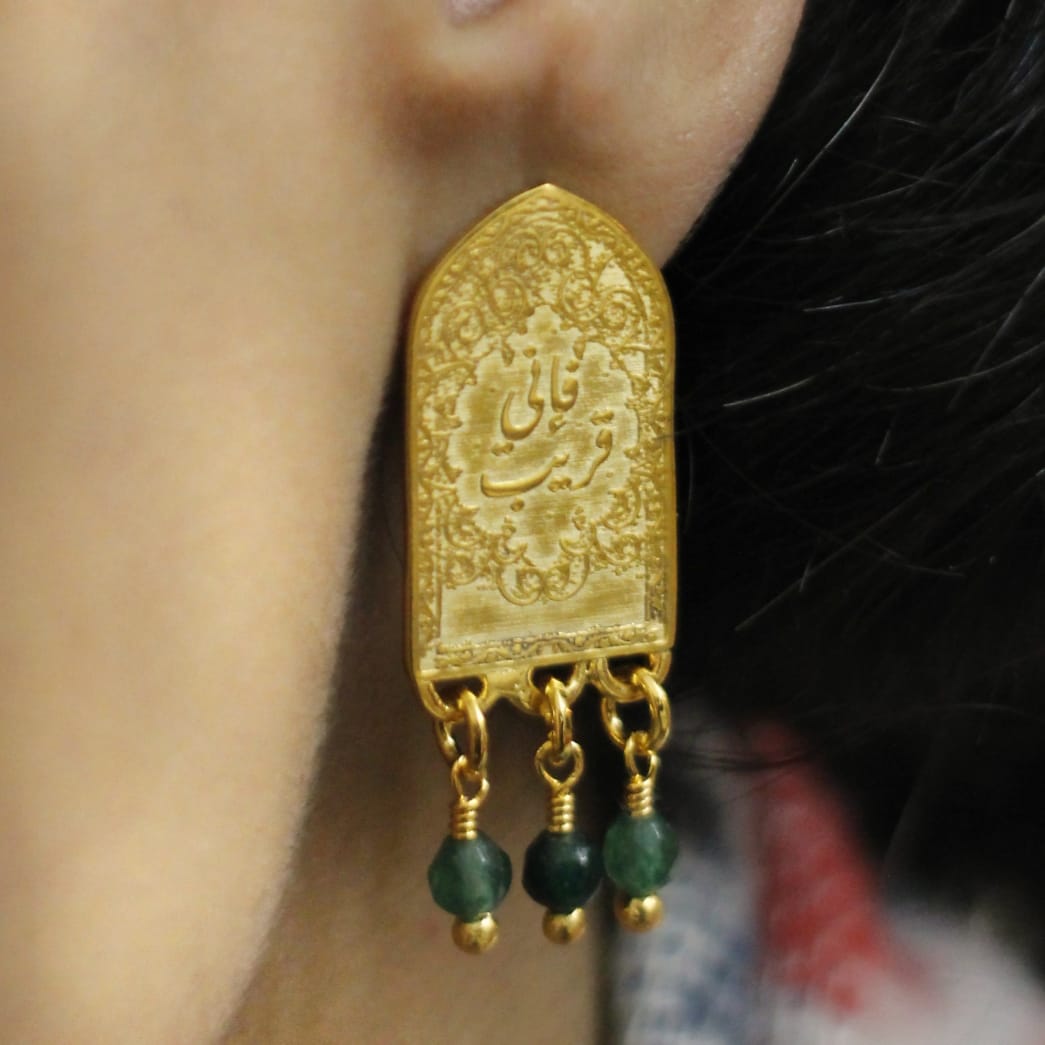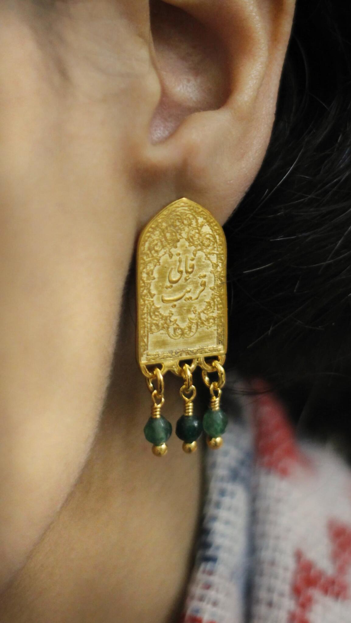 حلق نحاس مطلي ذهب عيار ٢١ احجار عقيق خضراء طول٣ سم تقريباً