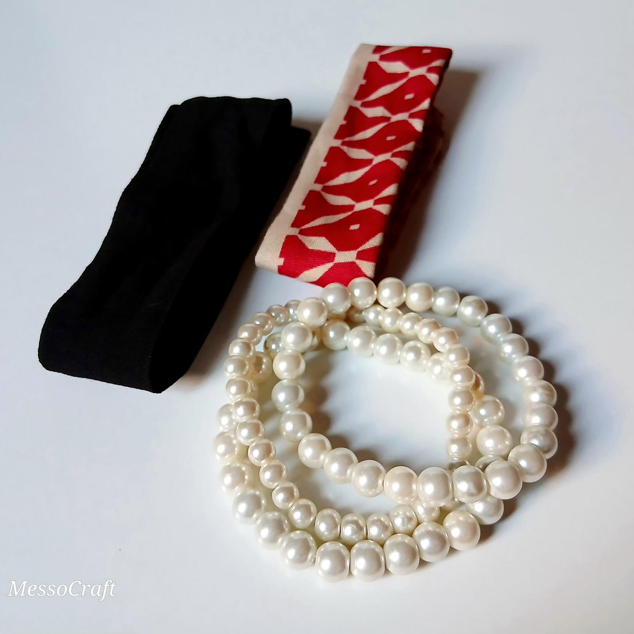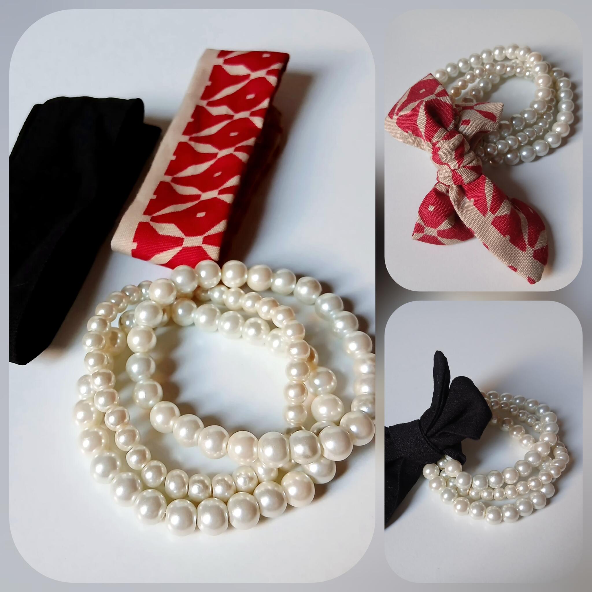 - 3 Bracelets Set made of off-white pearl beads in 2 different sizes with 2 ribbons (black and red with beige)