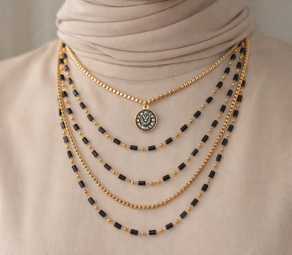 5-layered black necklace.