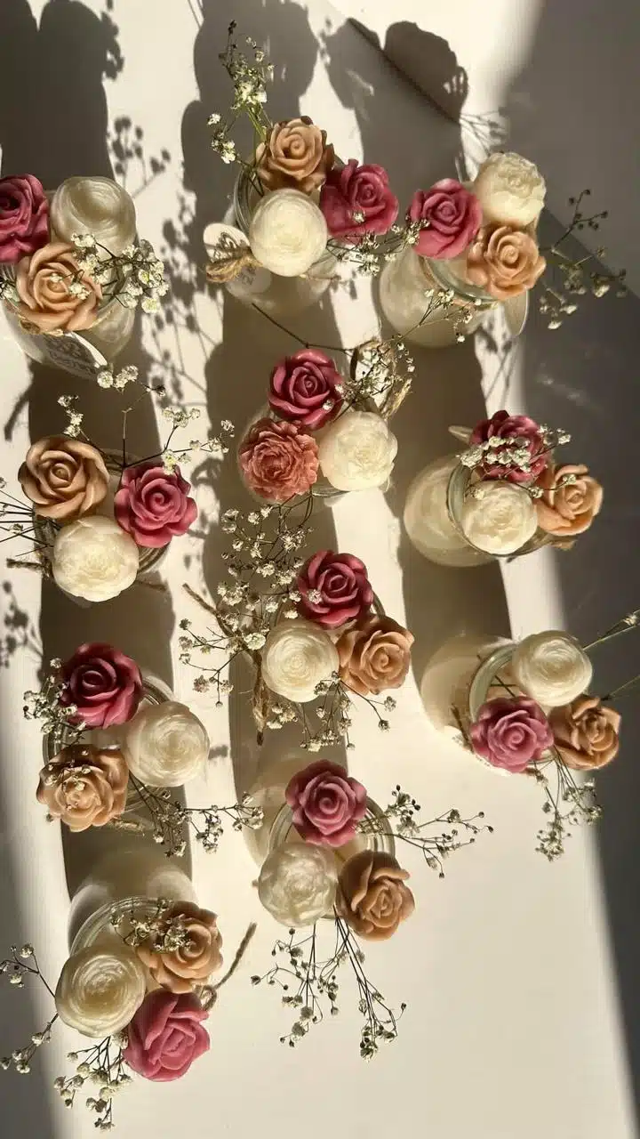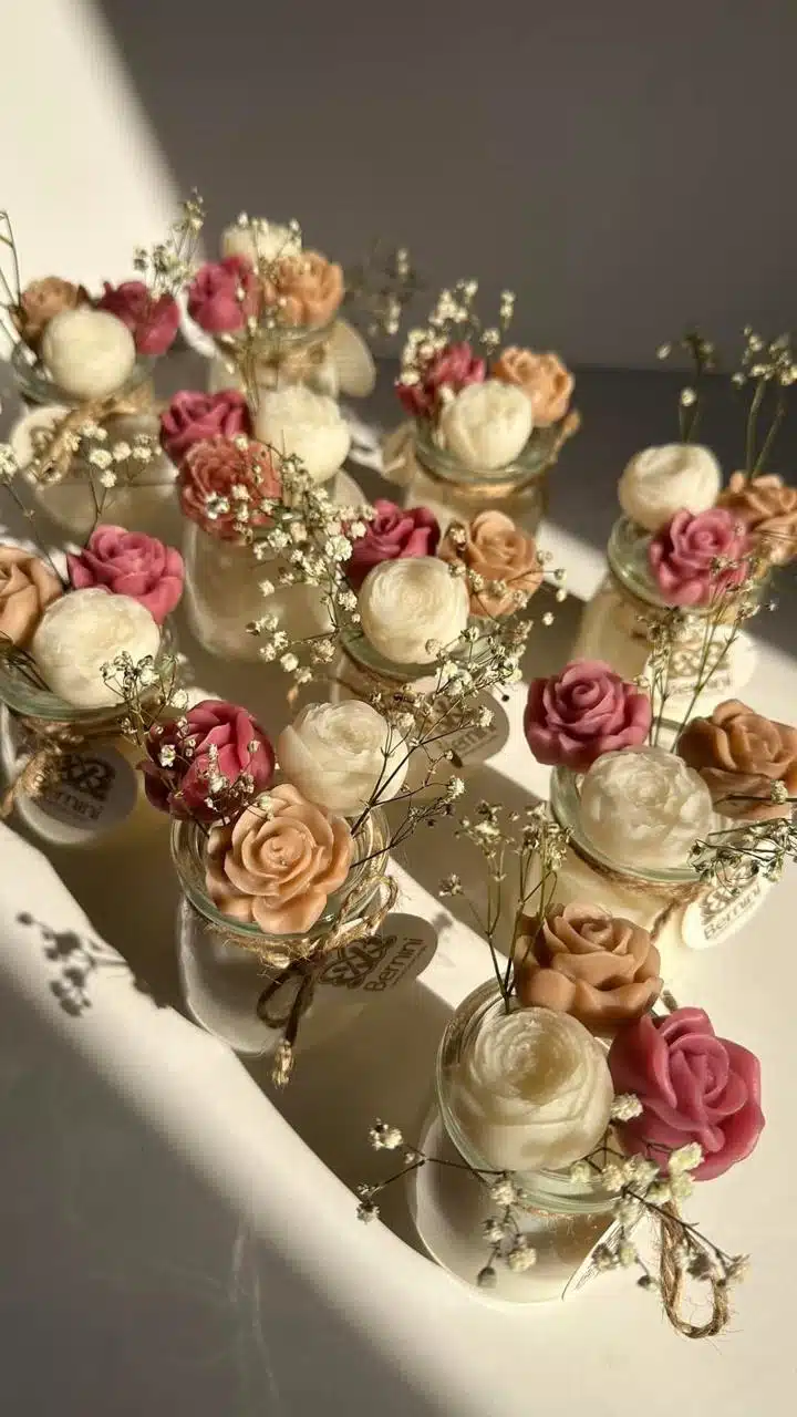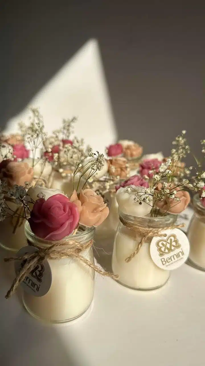 Set of 3 mini-scented flower bouquet jars; each contains three flowers to be used as wax melts.