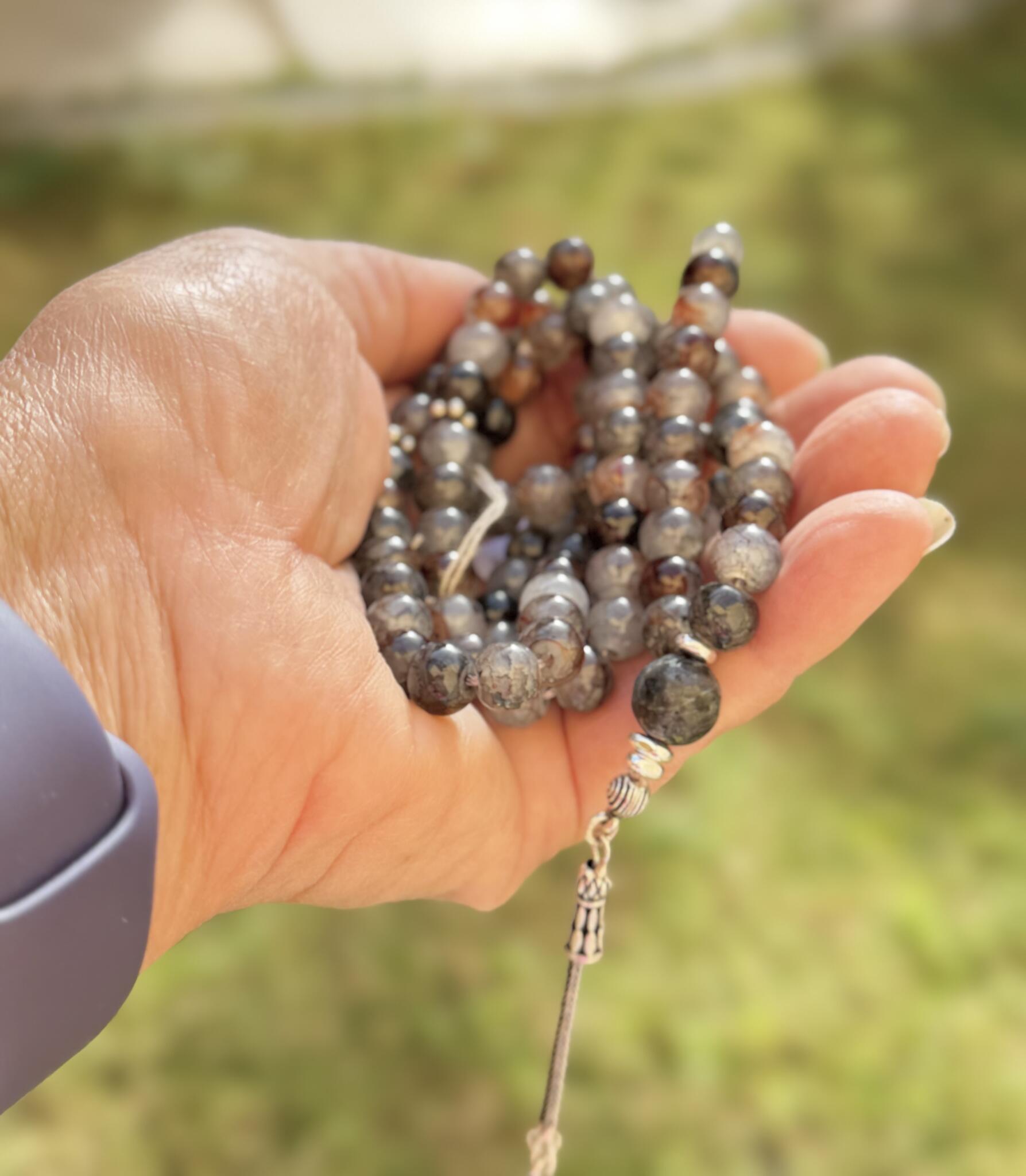 A grounded stone, 99 agate grey spider sebha, 925 silver Turkish tassel, space, silk thread ✨🌙