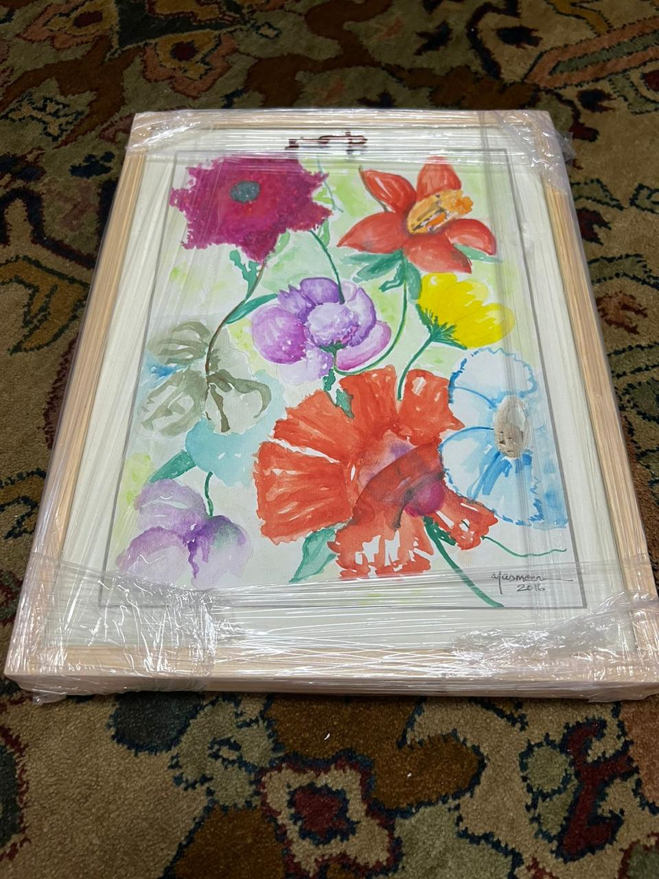a cheerful wall paper made of colorful flowers sized 21cm x 30cm framed with a wooden frame.