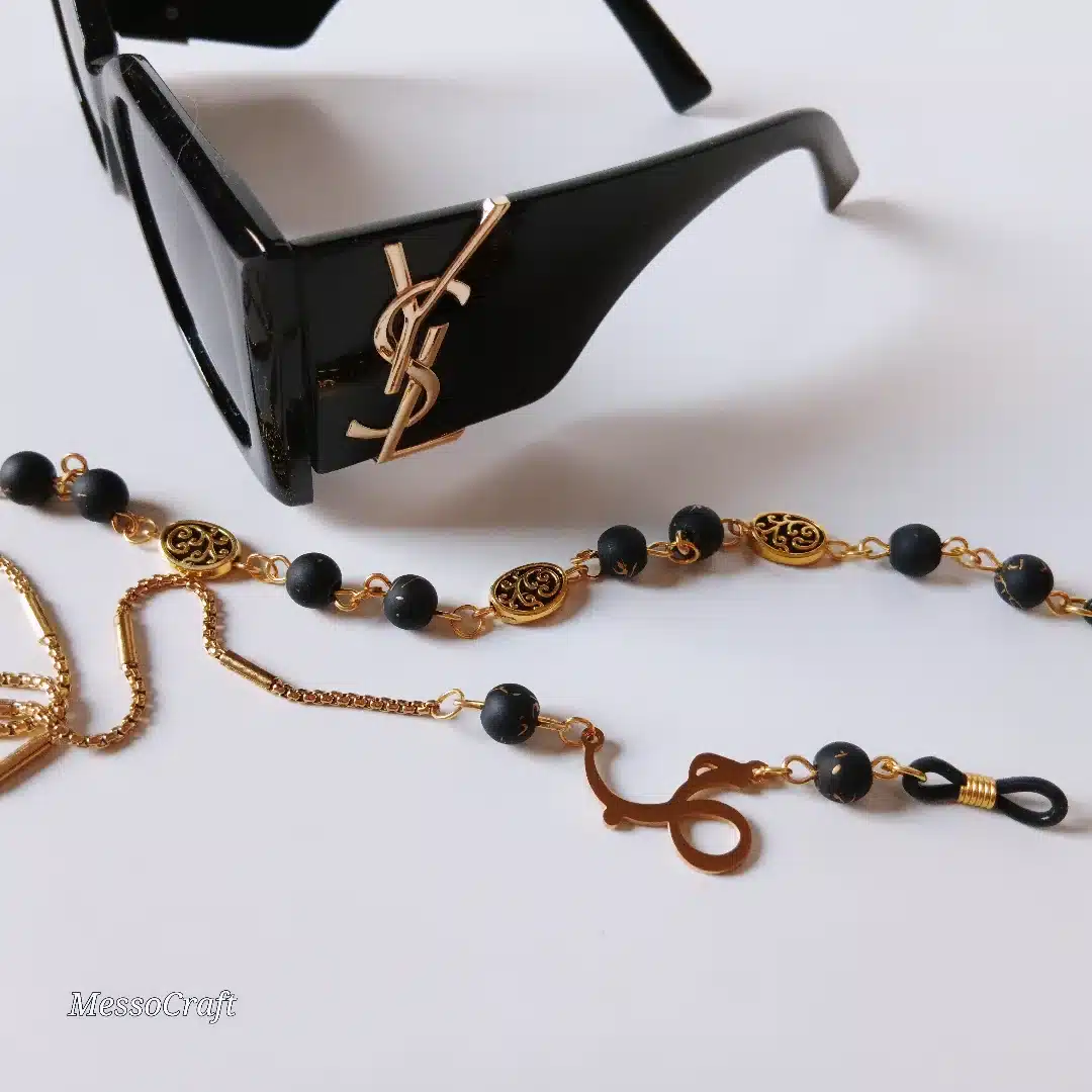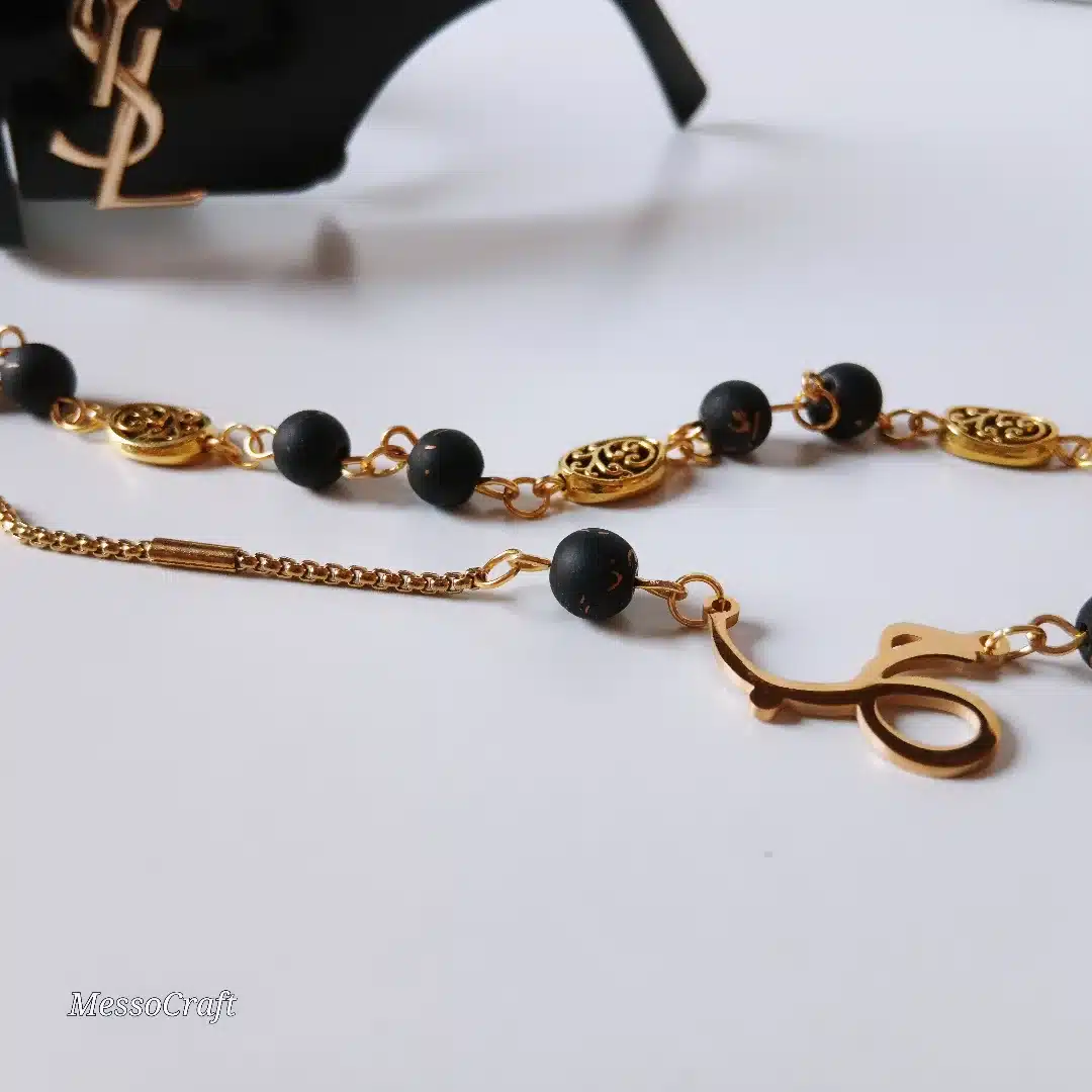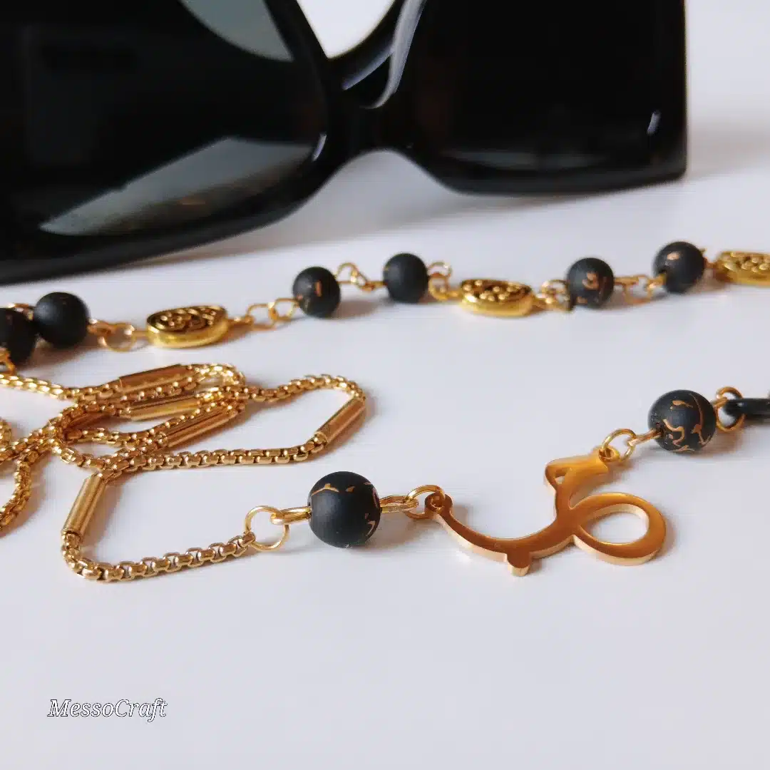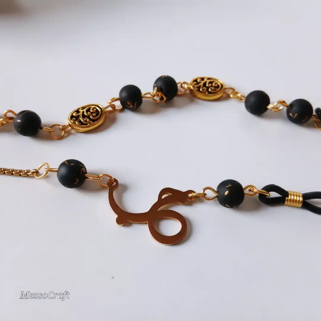 A unique glass chain made with love by using a Chinese gold arabic word “حب” pendant and matt black alabaster mixed with gold colour